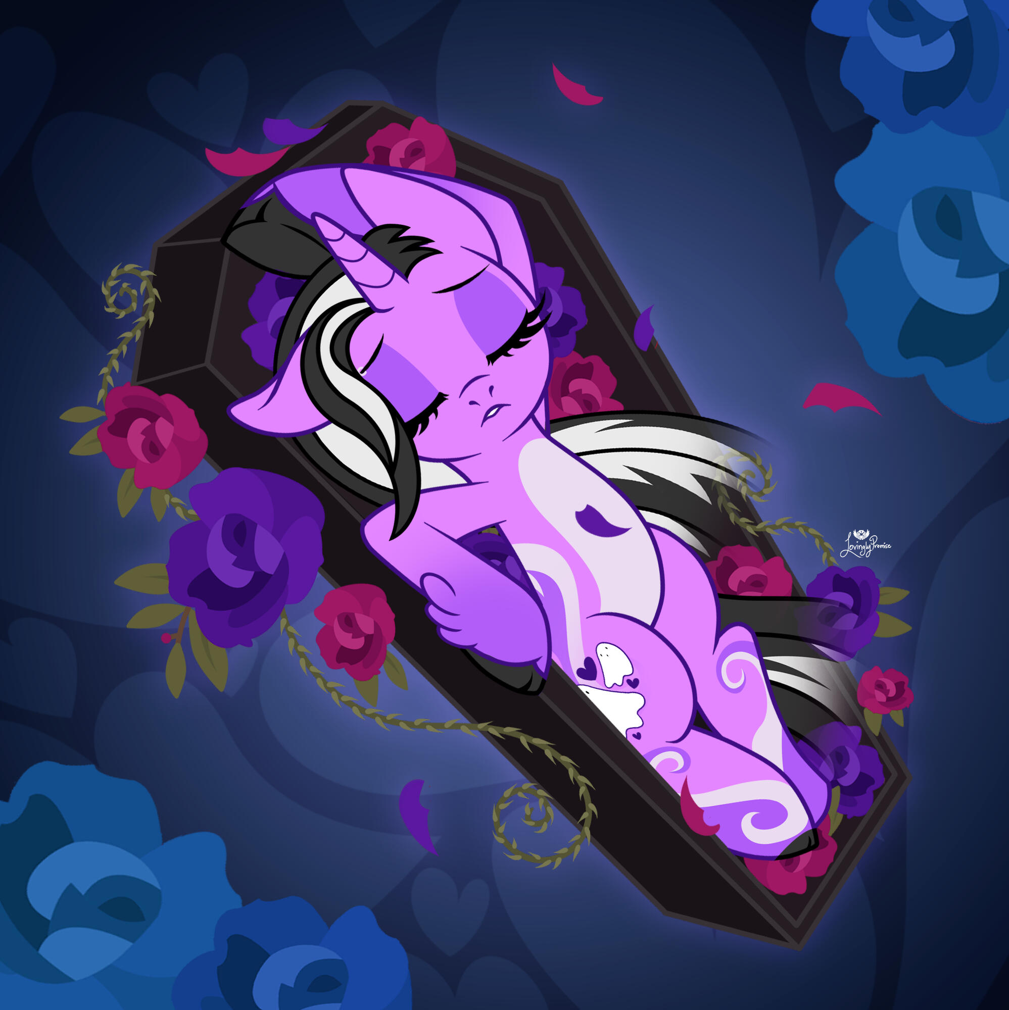 (A threnody is a song, poem, or hymn of mourning, typically performed as a memorial for a deceased person)Threnody Mourne is a unicorn with a rare and solemn gift, she can sense the presence of spirits who haven’t yet moved on, though not in the way most would assume. She doesn't see ghosts or speak to them directly. Instead, she feels their emotional presence: the lingering sorrow in a quiet room, the chill of unspoken regret clinging to an old keepsake, the way certain places seem to breathe with memories long past. Her magic is subtle, intuitive, and often difficult to explain to others, let alone control.She works as a gravekeeper and Soulway Investigator, a title she gave herself after years of uncovering why some spirits linger. Her role isn’t to solve murders or seek vengeance, she doesn’t chase villains or uncover crimes. Instead, she specializes in understanding emotional unrest. A spirit might remain due to an unresolved promise, the pain of being forgotten, or even something as small as a missing farewell. Threnody’s work is more like therapy for the dead, delivered through ritual, empathy, and deep investigation into a life that’s already ended.Her abilities come with strict limits. She can’t force a soul to move on, and sometimes, despite all her effort, they don’t. Her magic is tied to emotion and place, it reacts most strongly to items or locations charged with meaning. In areas saturated with spiritual unrest, her senses can become overwhelmed, leaving her mentally drained or physically ill. When the sun is at its highest and brightest, around noon, her connection to the unseen grows faint, like trying to hear whispers in a roaring wind.Threnody is intensely observant and emotionally attuned, but she keeps her thoughts close. She doesn’t speak often, preferring quiet spaces where she can listen to the stories that objects, spaces, and silences carry. Despite her affinity for the dead, she is not morbid, she is reverent. She treats the unknown with care and the forgotten with dignity. Her goal isn’t to banish spirits, but to bring clarity to their final chapters, to help them find whatever peace they were denied in life.She documents every case she takes, every moment where a spirit felt heard. Her journals are full of symbols, maps of emotional resonance, and soft reflections on grief. While many ponies find her unsettling or difficult to approach, those who are grieving, or who have experienced the unexplainable, often turn to her. She never promises resolution, only that she will try to understand.In the end, Threnody Mourne is a seeker of emotional truths. She doesn't fight shadows, she listens to them. Her work isn’t loud or celebrated, but it brings a quiet kind of harmony to the world. Where others see fear, she sees longing. Where others turn away, she stays, and listens.